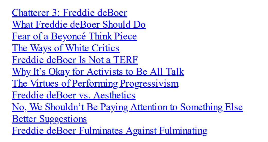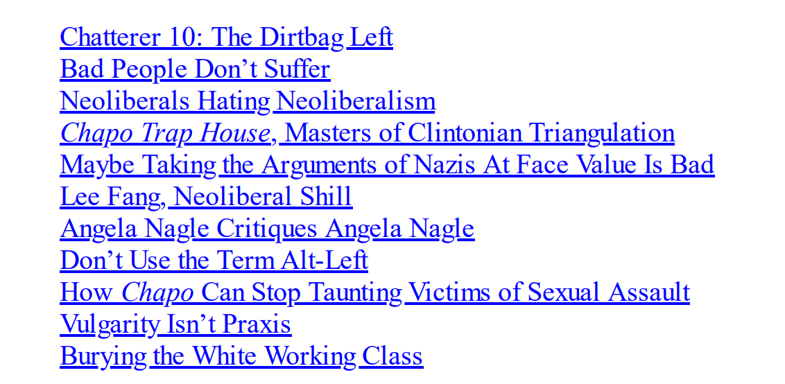 In one completely memory-holed oh-so-late-2010s Twitter moment, someone from Chapo Trap House1 retweeted a post from journalist Will Sommer. Sommer had posted about how cultural critic Noah Berlatsky had written Chattering Class Wars, a book of short essays2 covering online feuds and pundits that devoted "5-10 chapters each" to dissecting CTH as well as writers Freddie deBoer and Jesse Singal.